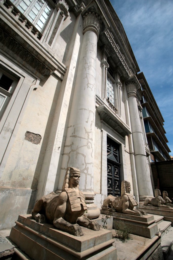 Flanqueando el edificio se encuentran cuatro esfinges y un dintel adornado con las alas de Horus.